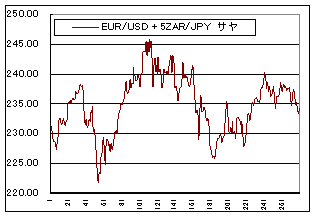 と求まります。これは”X”に対して”Y”が”a:b”の比率で組み込めば、最もボラティリティが抑えられるということになります。比率はEUR/USDを1ロットに対してZAR/JPYを5ロットにすればよさそうです。この比率で組み入れた”EUR/USD+5*ZAR/JPY”のサヤグラフを個々通貨ペアのボラティリティと比較しながら見てみましょう。ずいぶんボラティリティが抑えられらていることが見てわかります。